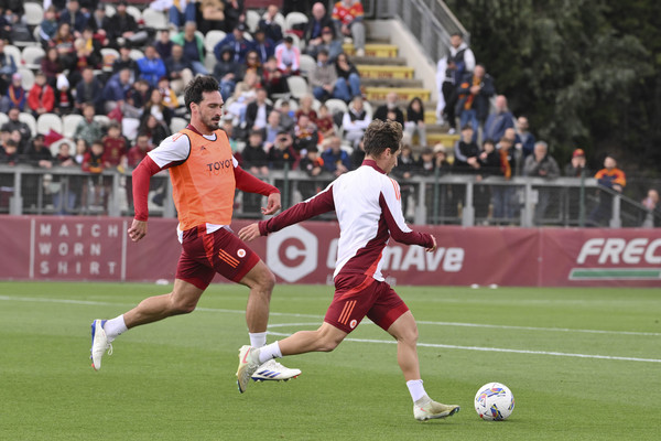 16.18 - Dopo il lungo torello la squadra svolge un'esercitazione 10 contro 10, senza portieri. Le squadre sono composte così: col fratino Celik, Hummles, Reale, Angeliño, Cristante, Soulé, Saelemaekers, Gourna-Douath, Pellegrini, Shomurodov. I bianchi sono Rensch, Mancini, Sangare, Ndicka, Paredes, Koné, Baldanzi, Graziani, Zefi, Salah-Eddine, Pisilli.