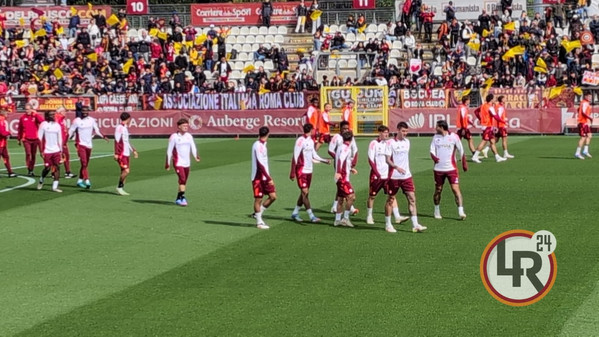 15.56 - Squadra in campo! I giocatori della Roma fanno il loro ingresso sul terreno di gioco del Tre Fontane, accolti dai tifosi presenti. Aggregati al gruppo anche i giovani della Primavera Zefi, Graziani e Reale.