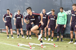 Trigoria: parte del lavoro in gruppo per Perotti. Terapie per De Rossi e Luca Pellegrini