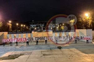 FOTO - Striscione dei tifosi fuori l'Olimpico: "Dzeko-Fonseca: ora combattete uniti per la maglia!"