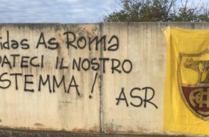 FOTO - Trigoria, scritta dei tifosi: "Adidas AS Roma ridateci il nostro stemma!"